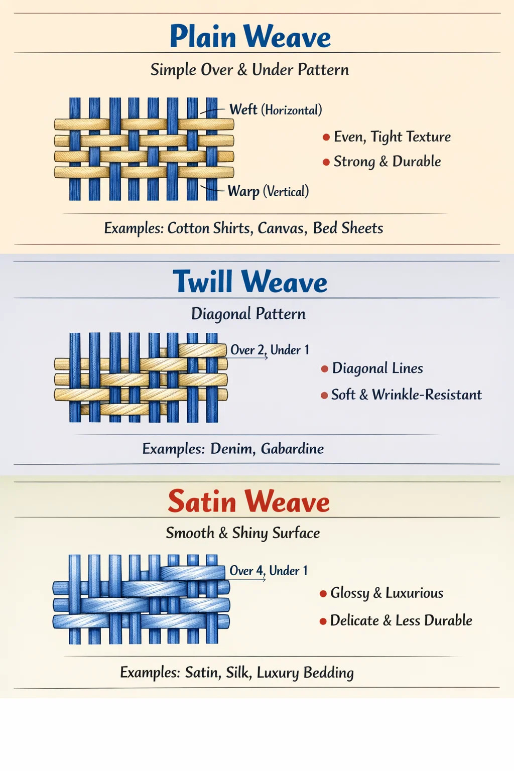 In textili industria, fere omnes textilia derivantur a tribus artificiis praecipue texendis. Hi tres modi texendi speciem fabricae, firmitatem, sentiunt.