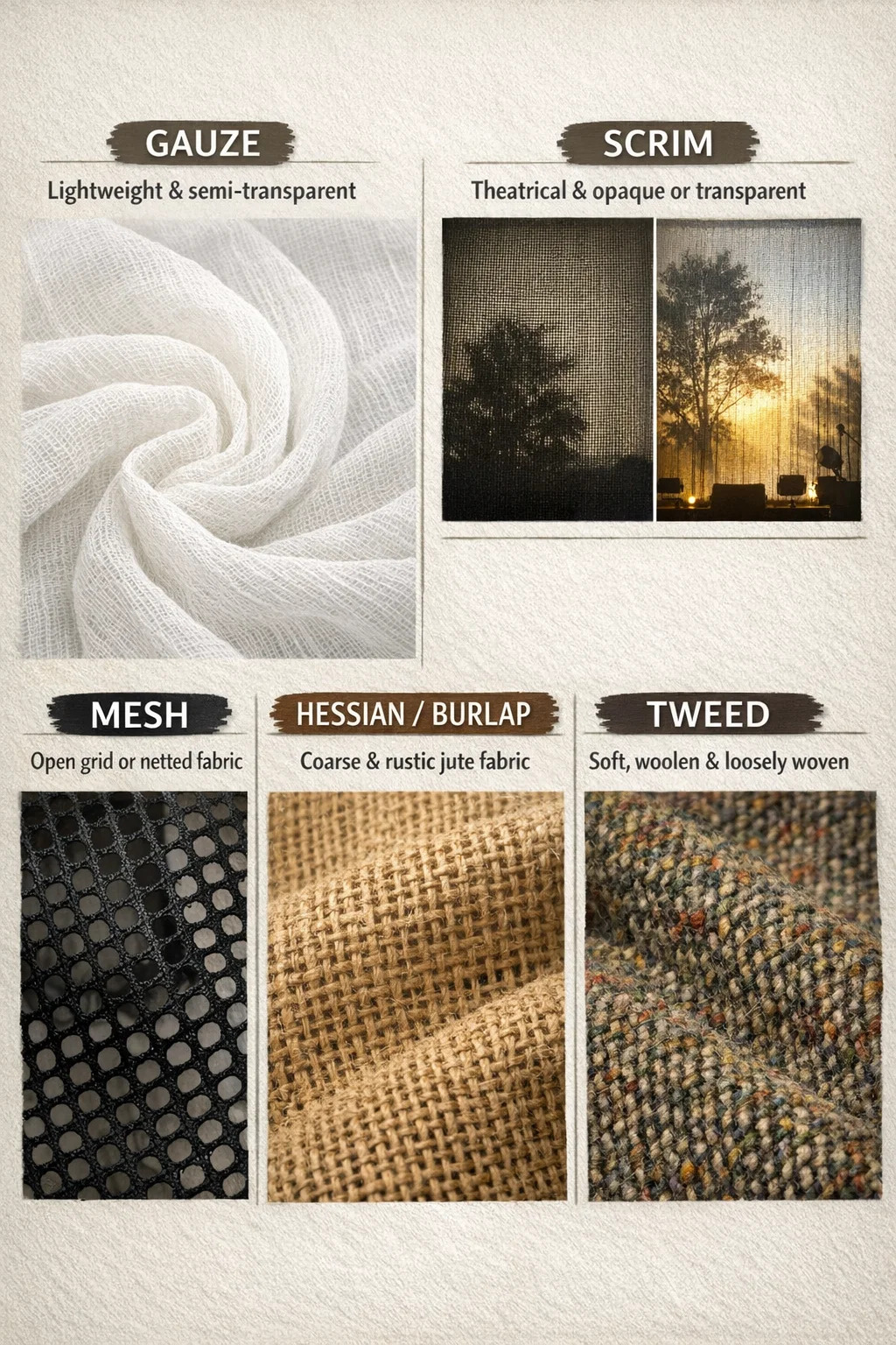 Cum de textilia cum "soluta textura et hiatus magnos," plura sunt vocabula valde specifica ad ea describenda, secundum usum et speciem eorum.