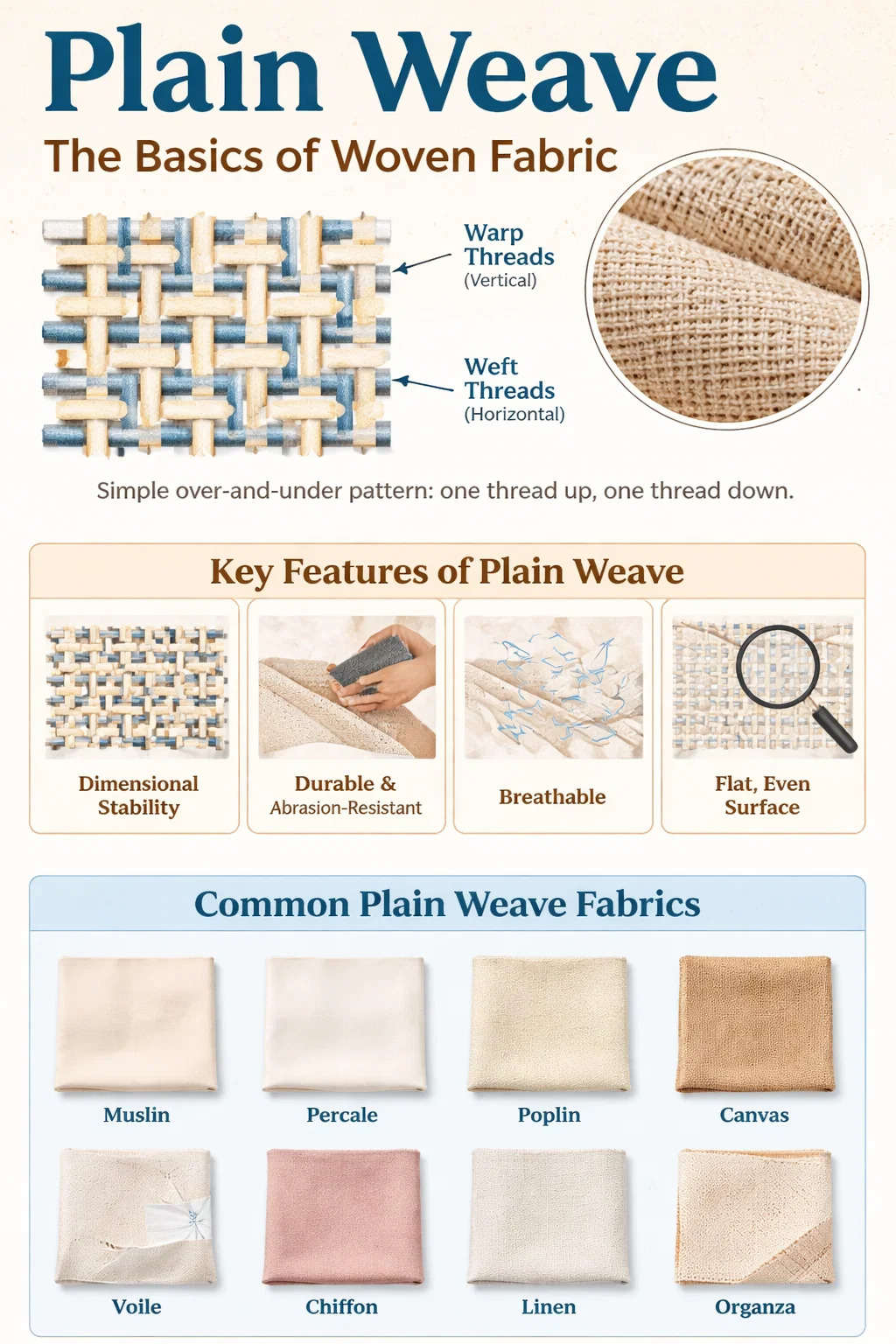 Praecipua textura is patet texere fabricae — textile factum stamen stamine intertexto (longitudinaliter currens) et fila subtegmina (transversim currentia) in simplici alternando supra et sub forma. Omne filum subtegumentum unum stamine transit, dein sub altera, per plenam latitudinem texturae. Versu sequenti adversam hanc consecutionem. Hoc artissimum, firmissimum, omnium contextarum structurarum firmissimum ac firmissimum creat, initiumque intelligendi est quomodo omnia textilia construantur.