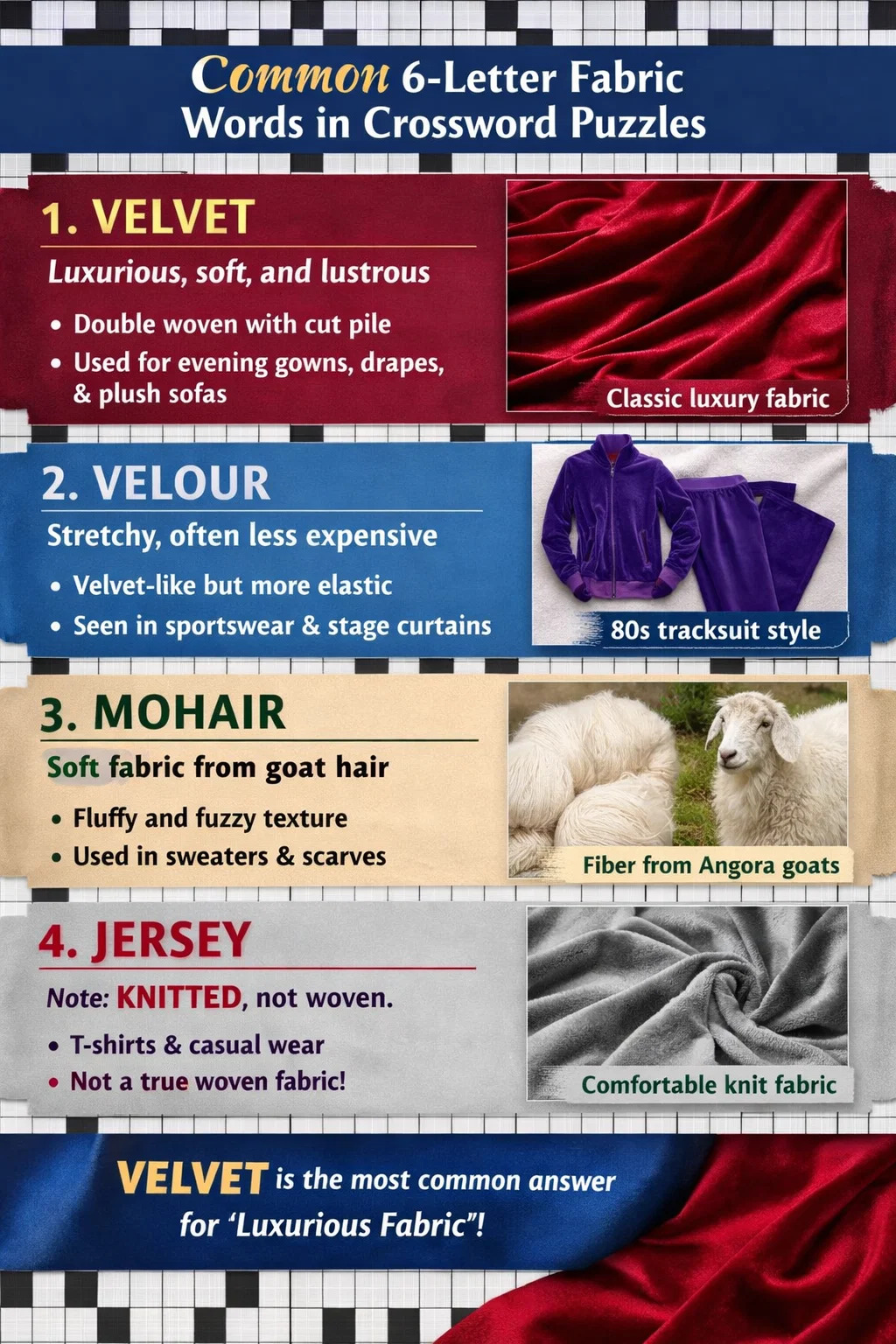 In crosswords sollicitat, si sensus describit "luxuriem, mollem et velutinam" 6-litteras. textura ordo classicus est VELVET.